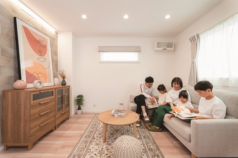 また、高断熱三層樹脂サッシやウレタンフォーム断熱材で住宅の断熱性能を高めたうえで、24時間換気システムも採用し、ランニングコストを抑えながら快適な暮らしを送ることができます。ダクトで空気を回すタイプの換気システムは効率がいい反面メンテナンスにコストがかかるため、当社では高性能セラミックを媒介とした熱交換換気システムを採用しました。「長野に暮らす子育て世帯を応援したい」その強い思いから、入手しやすく、メンテが簡単でお金がかからない設備仕様にこだわっています。