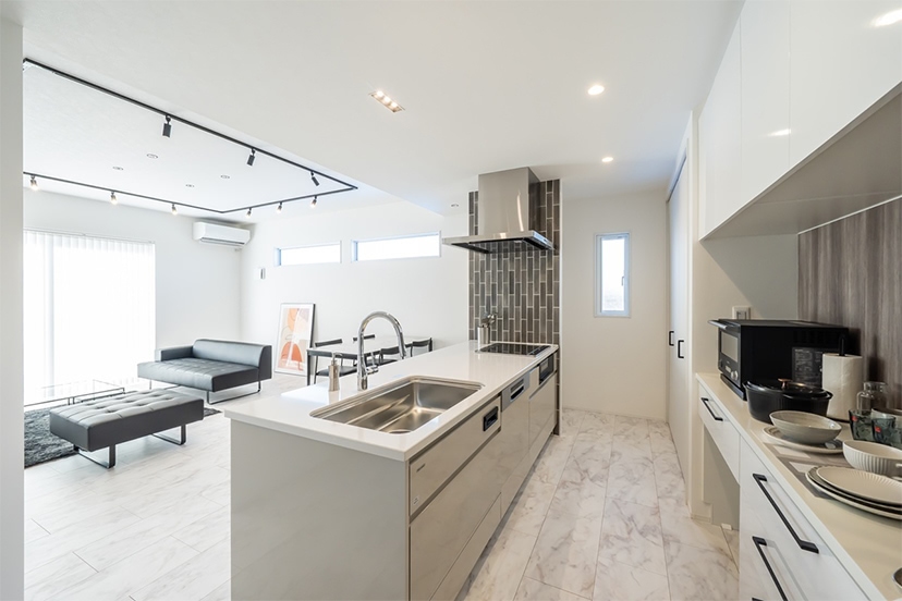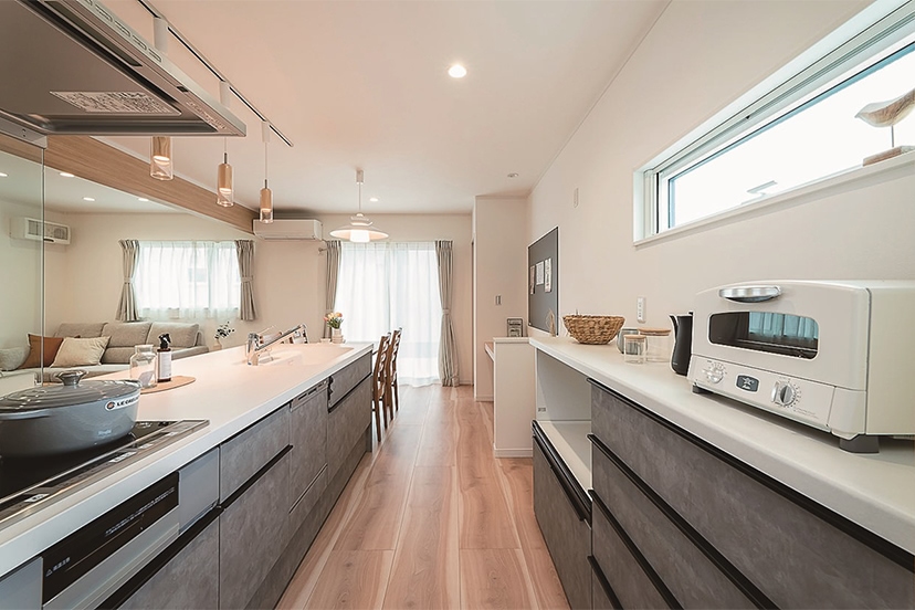 スマイルハウスは、注文住宅をつくる会社です。ハイクラスな「スマイルエコ」、スマイルエコより仕様などを手ごろにした「ハピスマ」、企画型住宅の「コンパクトスマイル」の3種がありますが、今回はモデルハウスとして使用していた最高品質の「スマイルエコ」を分譲します。スマイルエコは、高品質な設備仕様にこだわった家。耐震性や耐火性など災害に強く気密性に優れた2×4工法で、住宅性能にもこだわった家というと、価格が気になるところですが、スマイルハウスでは建材となるパネルの加工を自社グループで行うなどのさまざまな工夫で、若い子育て世帯にも手が届きやすい価格で販売することを実現しています。