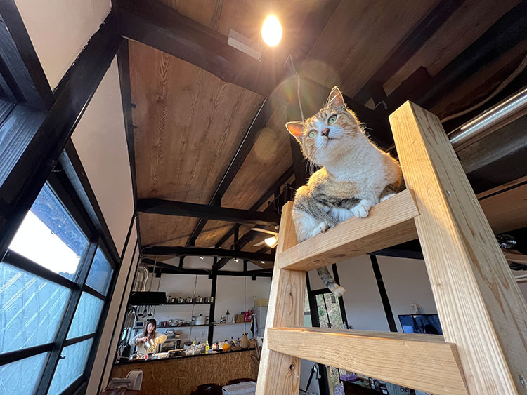 はしごを取り付けたら、看板娘が昇り降りするように。キッチンでは理沙さんが作業中