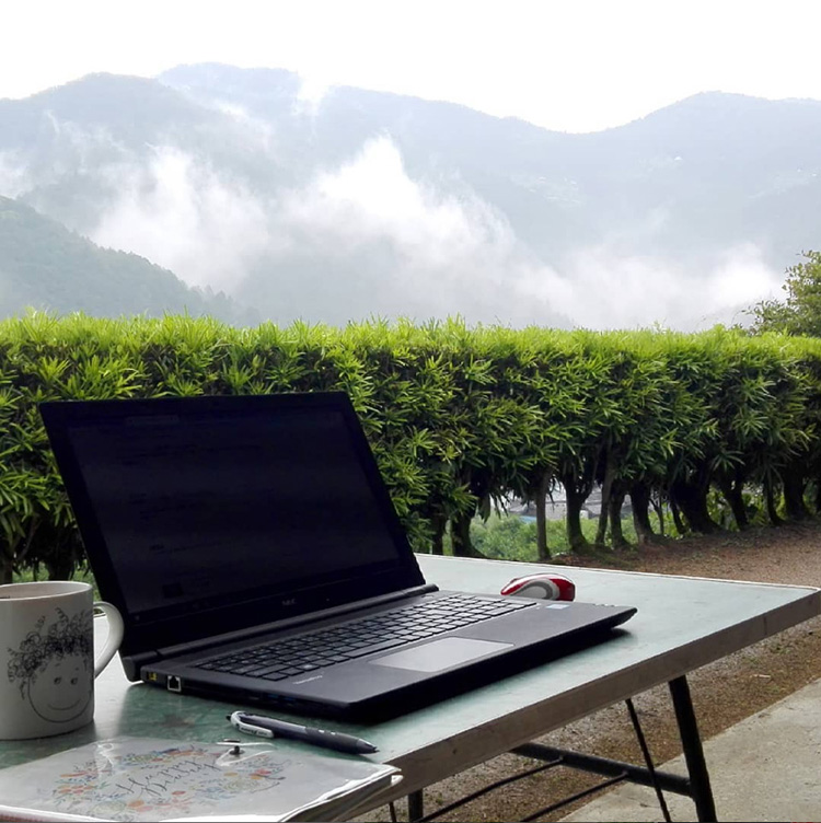心地いい季節には縁側にテーブルを出して、山々を眺めながら作業