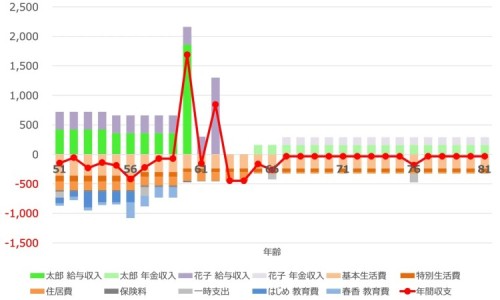 このグラフは 31 年分で、収入を上向きの棒グラフ、支出を下向きの棒グラフ、年間収支を赤の折れ線グラフで示しています。この例ではご夫婦が退職金を受け取るタイミングで収入が大きくなっていること、そして公的年金を受け取り始めるまでの間は大きな赤字になること、などがご理解いただけるのではないでしょうか。