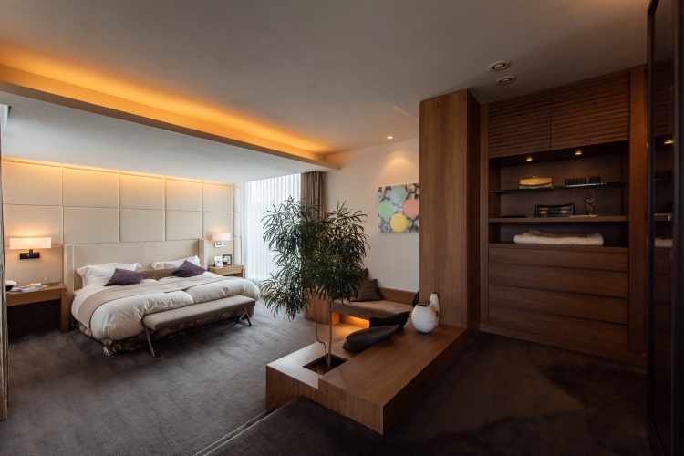 ラグジュアリーなベッドルーム。天井の照明がほっとくつろげる