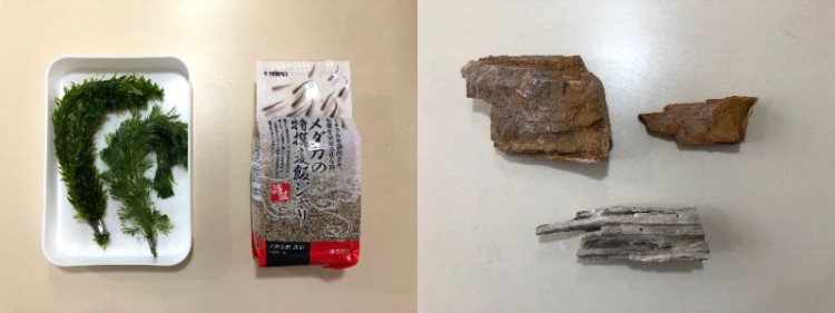 水草と底砂も近所の観賞魚店で購入(左)。流木は乾燥していると浮いてしまうので水に浸けてから使うのがポイント(右)