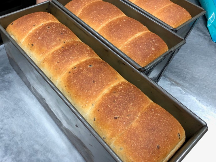 焼き上がったばかりの天然酵母の食パン。手前は天然酵母に17穀米を加えたもの(一斤260円)
