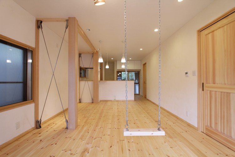 スケルトンリフォームをした事例。部屋の中央にブランコを設置して、子どもがのびのびと遊べる部屋に