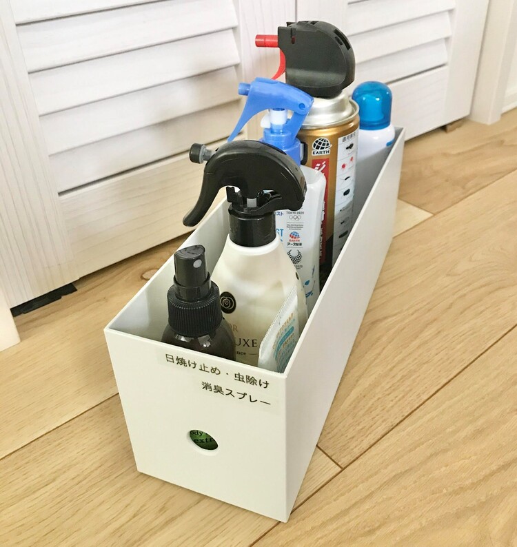 虫よけ、殺虫剤、日焼け止め……。夏になると頻繁に使うこれらのアイテムは、玄関にあるのがベスト。こういったアイテムはボックスにひとまとめ。よく使う夏はこのまま玄関に置き、あまり使わないシーズンには別の場所に収納するなども簡単にできます。