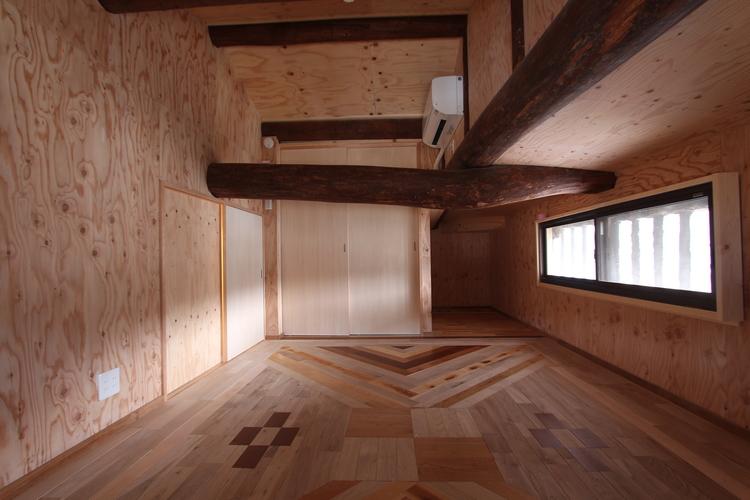 こちらは築60年ほどの家屋をリノベーションした事例です。天井を取っ払い、大きな梁を現わしにすることで重厚感を感じることのできる空間に仕上がっています。無垢フローリングでデザインした床材に合板を素地仕上げにすることで木の温かみを感じつつ、コストカットを行いました。