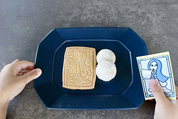 ワクワクしながらフタを開けると、かっぱとゆきおんなそれぞれのイラストの型抜きサブレと白くて丸いクッキーが入っていました。