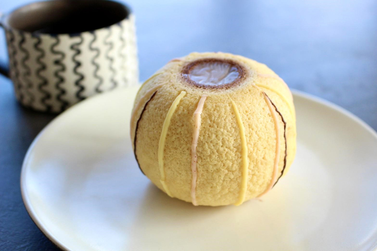 ころんとした形のバウムクーヘン「ミニてまりん」。バウムクーヘンとしてよく知られている丸型とは佇まいが異なる、球型なのが特徴。ころころ転がりそうなくらい、きれいなまんまるです。
